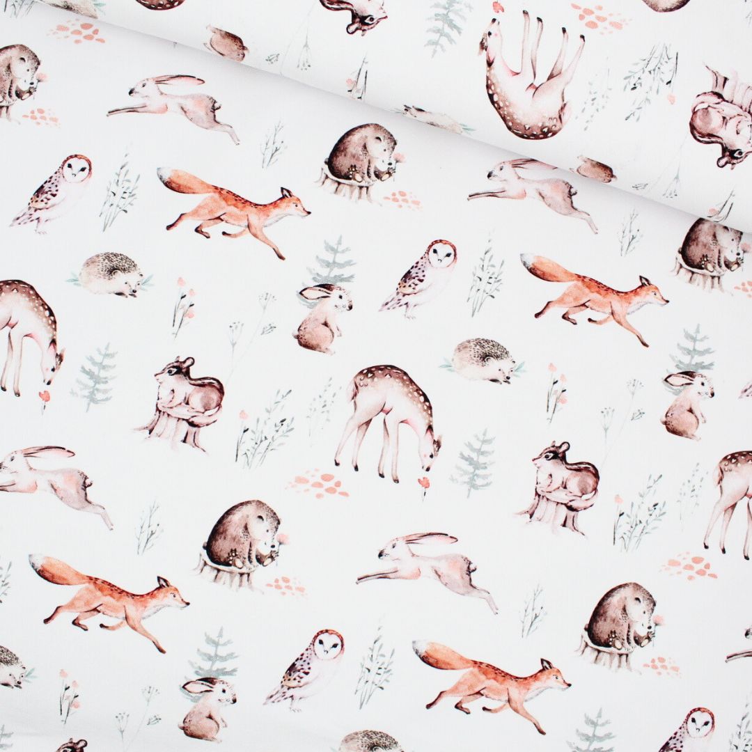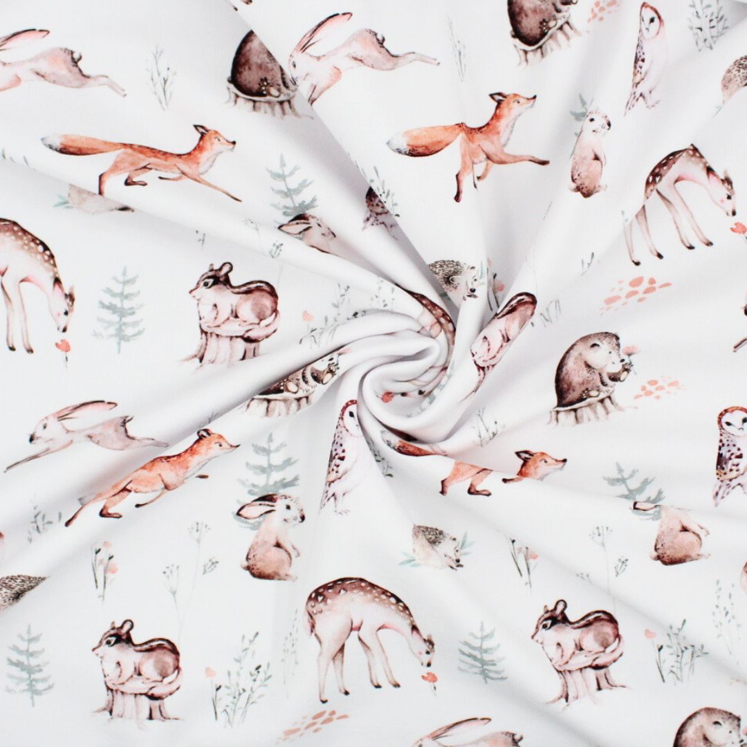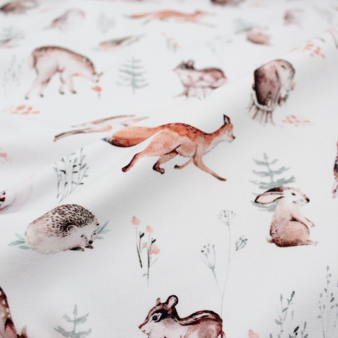 French Terry Sommersweat Waldfreunde Winter – Meterware Kinderstoff mit Fuchs, Eule, Bär, Hase & Reh