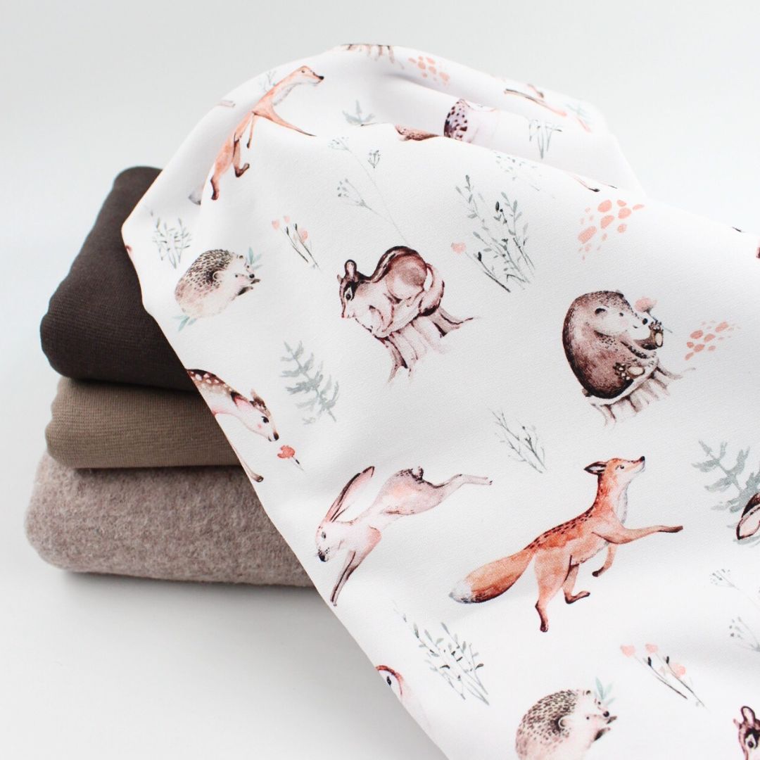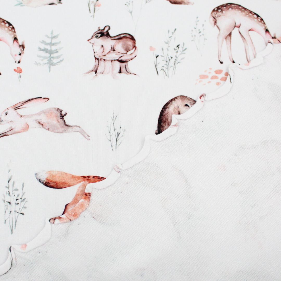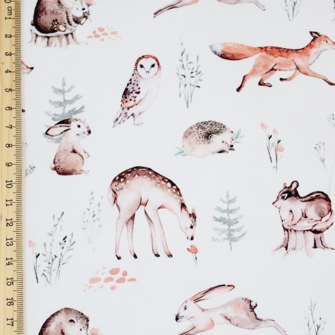 French Terry Sommersweat Waldfreunde Winter – Meterware Kinderstoff mit Fuchs, Eule, Bär, Hase & Reh